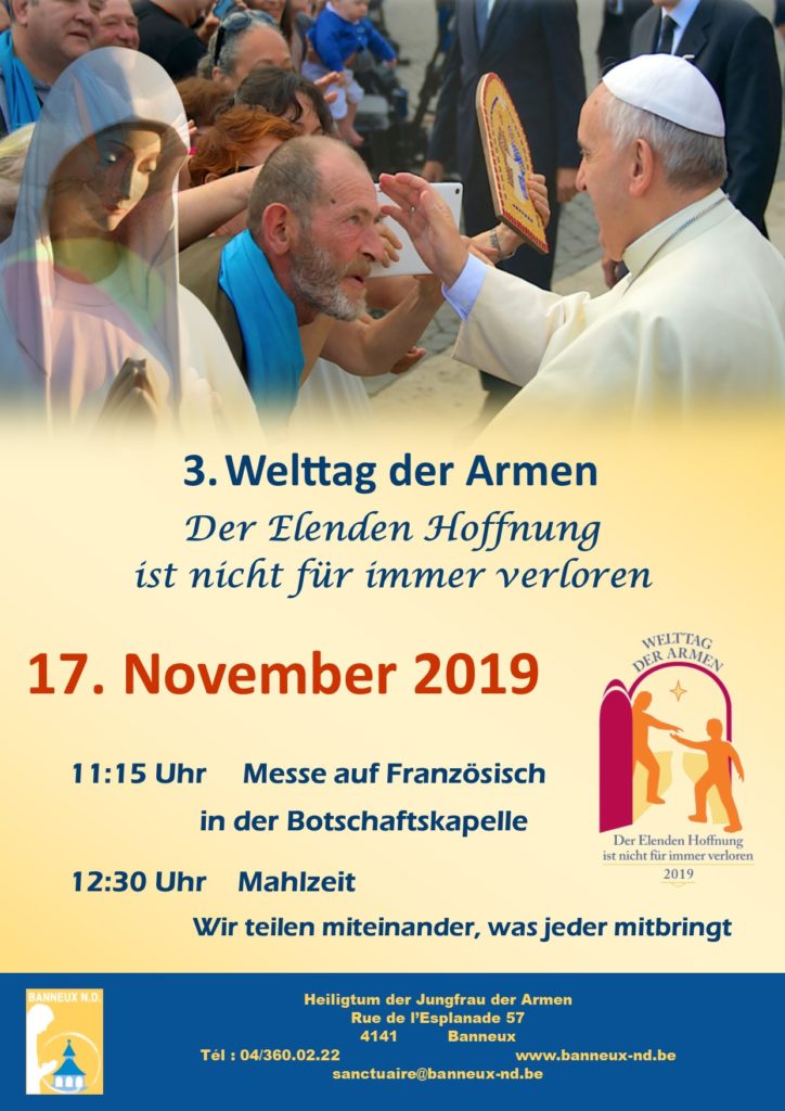 3.Welttag der Armen 6 November 20196 November 2019 Der Elenden Hoffnung ist nicht für immer verloren 17. November 2019 11:15 Uhr Messe auf Französisch in der Botschaftskapelle 12:30 Uhr Mahlzeit – Wir teilen miteinander, was jeder mitbringt Partagez ! Share this!Klicken zum Ausdrucken (Wird in neuem Fenster geöffnet)Klick, um dies einem Freund per E-Mail zu senden (Wird in neuem Fenster geöffnet)Klick, um auf Facebook zu teilen (Wird in neuem Fenster geöffnet)Klick, um auf Pinterest zu teilen (Wird in neuem Fenster geöffnet)Klick, um über Twitter zu teilen (Wird in neuem Fenster geöffnet)Klicken, um auf WhatsApp zu teilen (Wird in neuem Fenster geöffnet) 17. November 2019, Banneux, Welttag der Armen A la Une