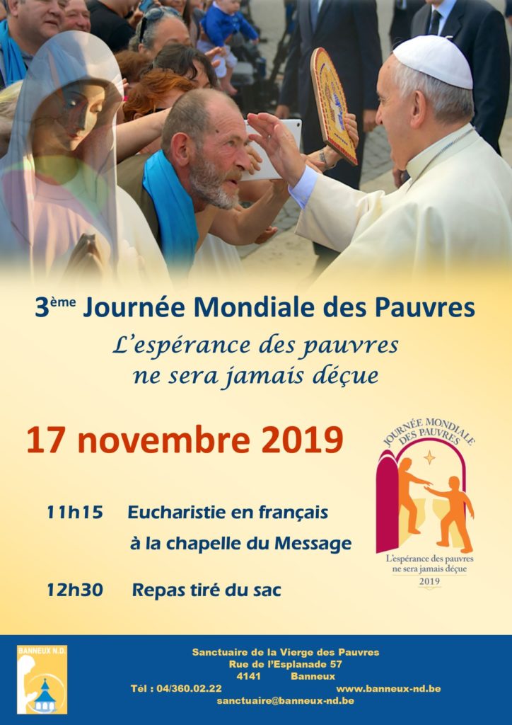 3ème Journée mondiale des Pauvres 6 novembre 20196 novembre 2019 L’espérance des pauvres ne sera jamais déçue ! 17 novembre 2019 11h15 Eucharistie à la chapelle du Message, présidée par l’abbé Palm, avec la chorale du Poverello 12h30 Repas tiré du sac Partagez ! Share this!Cliquer pour imprimer(ouvre dans une nouvelle fenêtre)Cliquez pour envoyer par e-mail à un ami(ouvre dans une nouvelle fenêtre)Cliquez pour partager sur Facebook(ouvre dans une nouvelle fenêtre)Cliquez pour partager sur Pinterest(ouvre dans une nouvelle fenêtre)Cliquez pour partager sur Twitter(ouvre dans une nouvelle fenêtre)Cliquez pour partager sur WhatsApp(ouvre dans une nouvelle fenêtre) 3ème journée mondiale des pauvres, journée mondiale des pauvres A la Une