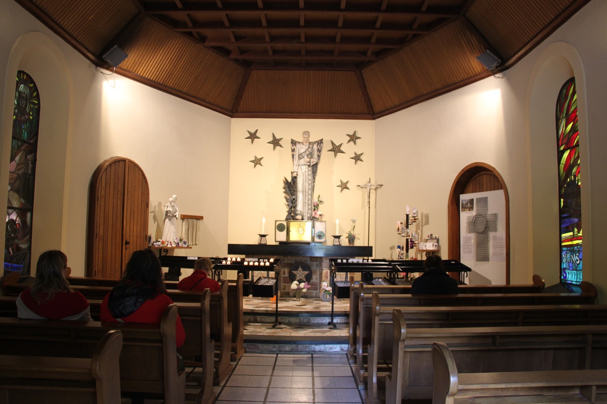 Saint Ignace, ancien militaire, devint soldat du Christ après avoir été gravement blessé à la guerre. Il fonda la Compagnie de Jésus : les Jésuites. À l’occasion des cinq cents ans de la naissance d’Ignace, en 1991, une nouvelle chapelle a été construite dans l’allée Saint-Michel (la première, inaugurée en 1960, n’existe plus). Le projet du nouveau monument a été conçu par un jeune jésuite architecte.