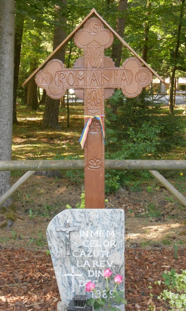 Sur une pierre, au pied de la croix, est écrit le texte suivant : En souvenir des martyrs et des héros, victimes du totalitarisme athée. Des exilés roumains en Belgique – Banneux 1995.