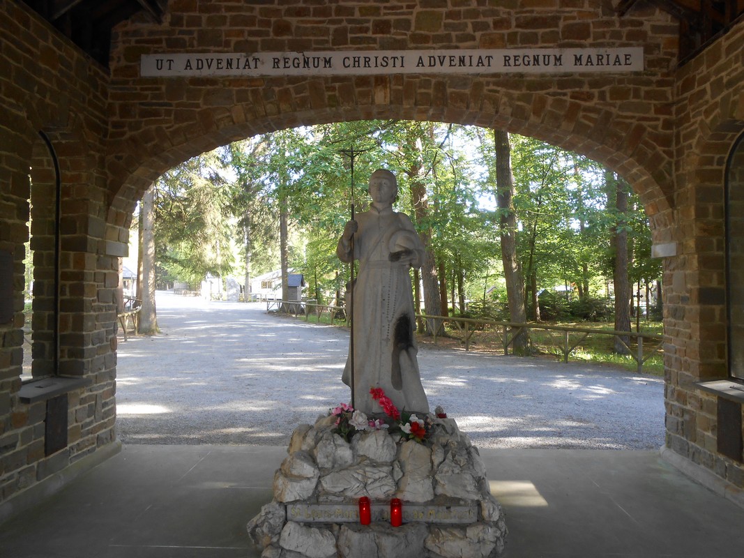 Le saint est présenté comme un pèlerin, le chapeau sous le bras, le bâton à la main, en marche vers la source. Si quelqu’un a prié Marie, c’est bien Grignion de Monfort. Sa dévotion à la Sainte Vierge dynamisait sa foi. Grâce à la générosité des pères Montfortains, un vaste cloître a été construit en face de la source. Sur la paroi, derrière la statue, se trouve la devise de saint Louis Marie Grignion de Montfort : Ut adveniat regnum Christi, adveniat regnum Mariae (Qu’advienne le règne de Marie, pour qu’advienne le règne du Christ).