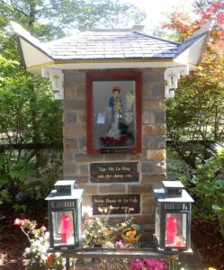 Chaque 1er samedi du mois, un groupe de prière vietnamien vient se recueillir à Banneux. Les membres de cette communauté ont construit une stèle, en l’honneur de Notre-Dame de La Vang, mère des martyrs.