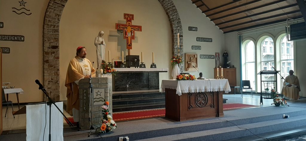 Nous continuerons à trouver à Banneux Marie qui nous amène à Jésus. Jésus qui a dit : « Venez à moi, vous tous qui peinez sous le poids du fardeau… et vous trouverez le repos pour votre âme » (Mt 11, 25-30). Jésus est « doux et humble de cœur », il affirme que Dieu le Père est proche des tout-petits : « Ce que tu as caché aux sages et aux savants, dit Jésus à son Père, tu l’as révélé aux tout-petits ». Jésus est proche de nous dans notre faiblesse et il nous donne le repos. Il est discret. Parfois nous aimerions que Jésus agisse de manière sensationnelle et autoritaire. Mais comme l’annonçait le prophète Isaïe à propos du Messie à venir : « Il ne criera pas, il ne haussera pas le ton, il ne fera pas entendre sa voix au-dehors » (Isaïe (42, 1-4.6-7). La présence de Dieu ne s’impose pas, elle est discrète. Elle agit d’abord dans nos cœurs. Et je voudrais souligner ici la présence active de ceux et celles qui ont aidé leur prochain dans ces circonstances. Je remercie les membres du personnel soignant et tous ceux qui ont travaillé à notre subsistance durant ces derniers temps. Je remercie ceux qui ont se sont mis au service de l’autre. Parfois c’est avec des moyens très simples, par exemple en applaudissant le soir à 20 h. dans les rues et aux fenêtres pour remercier le personnel soignant. Cela a permis à certaines personnes de rencontrer des voisins qu’ils n’avaient jamais rencontrés. Ainsi on donne le peu qu’on a. C’est comme Pierre et Jean, qui rencontrent un mendiant infirme à la sortie du temple de Jérusalem ; Pierre lui dit: « De l’argent et de l’or, je n’en ai pas ; mais ce que j’ai, je te le donne : au nom de Jésus Christ le Nazaréen, lève-toi et marche » (Ac 3,1-10). D’un bond, il fut debout, ajoute la narration, et il marchait » À nous aussi, qui mendions au Seigneur une vie plus sereine et plus paisible, le Seigneur nous dit : « Lève-toi et marche ».